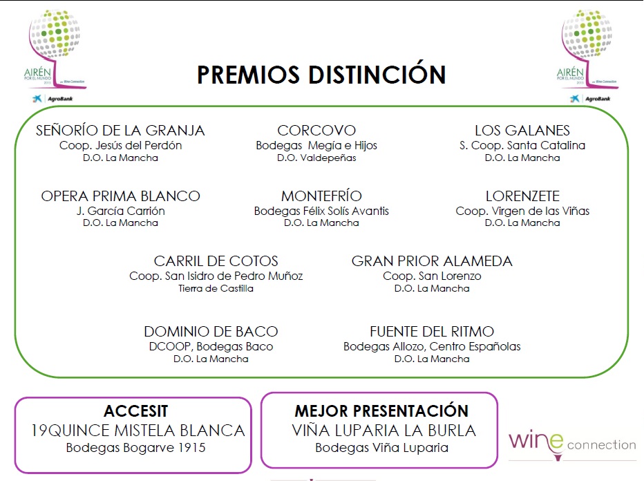 Todos los vinos podrán optar a tres categorías, Medalla de Oro, de Plata y Gran Oro y a una distinción excepcional, ‘Airén por el Mundo’, que se otorga al vino de mayor puntuación. Aunque como dice su organizador, Jose Manuel Torres Poveda, “da igual el resultado, lo importante es que haya una gran participación en todas las modalidades para que todos salgamos ganando con el mejor premio: prestigiar el Airén”.
