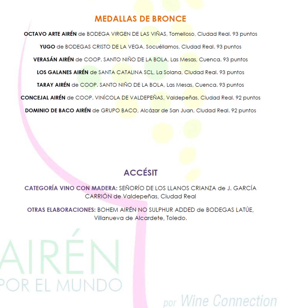 Obtendrían medalla de bronce en la categoría Joven Airén los siguientes vinos: el tomellosero “Octavo Arte Airén”, de Virgen de las Viñas; “Yugo”, de Bodegas Cristo de la Vega, de Socuéllamos; “Verasán” y “Taray”, ambos de la Cooperativa Santo Niño de la Bola, de Las Mesas; “Los Galanes” de Santa Catalina; “Dominio de Baco” de Grupo Baco y “Concejal Airén”, de la Vinícola de Valdepeñas.